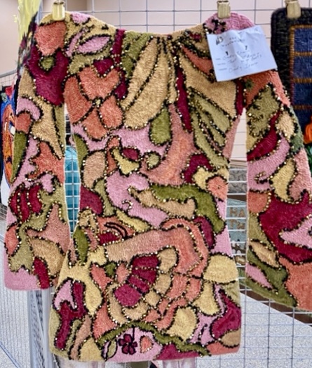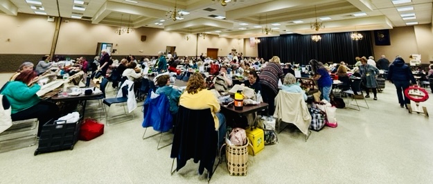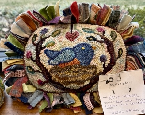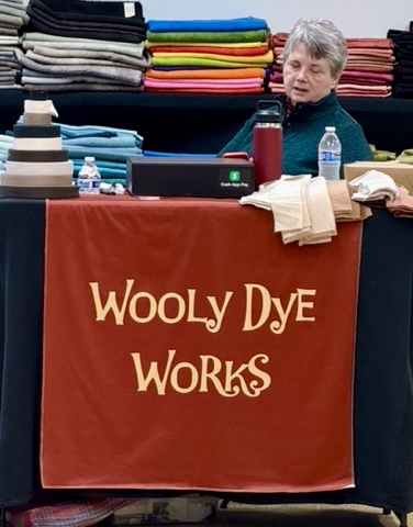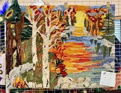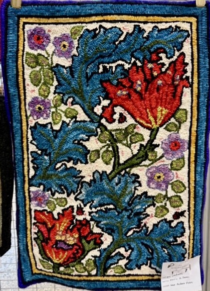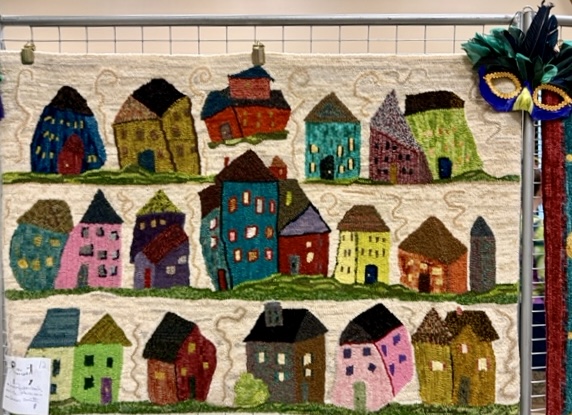 Woolwrights Hook-In, March 18, 2025. Hundreds of women - men, too! -hooking through the room. Word spread about Sharon’s story rug and soon she was sharing it as people came to marvel over it. Karen won a yard of fabric as a door prize and there were plenty of vendors, including our own lovely Marian! And of course, a wall of beautifully hooked rugs.